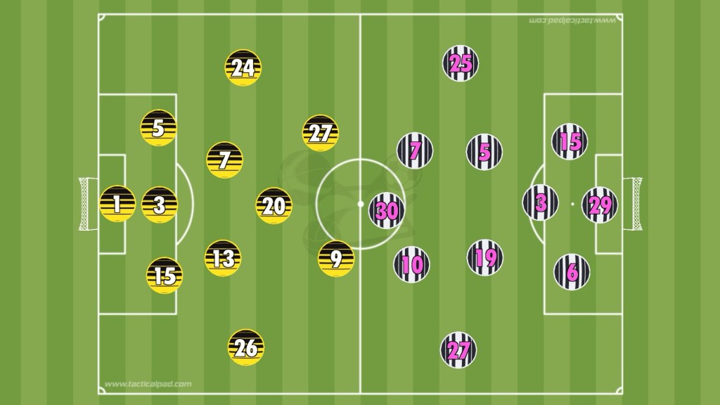Despite Juventus’ pressure, Dortmund managed to play through it, launching quick attacking transitions with crosses and combination play. Juventus dropped into a three-at-the-back shape when defending, both central midfielders acting as defensive screens. The wing-backs stayed high and wide to stretch Dortmund’s press and create counter-attacking options, leaving only the centre-forward upfield.