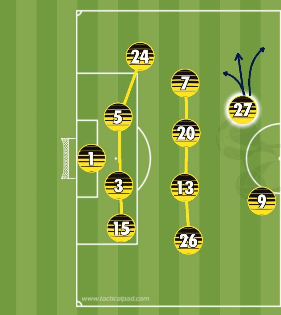 The left wing-back moved inside as a left central midfielder, with the attacking midfielder taking the right central midfield role. Adeyemi shifted from striker to left winger, Ryerson moved up to right wing, and Guirassy stayed central.