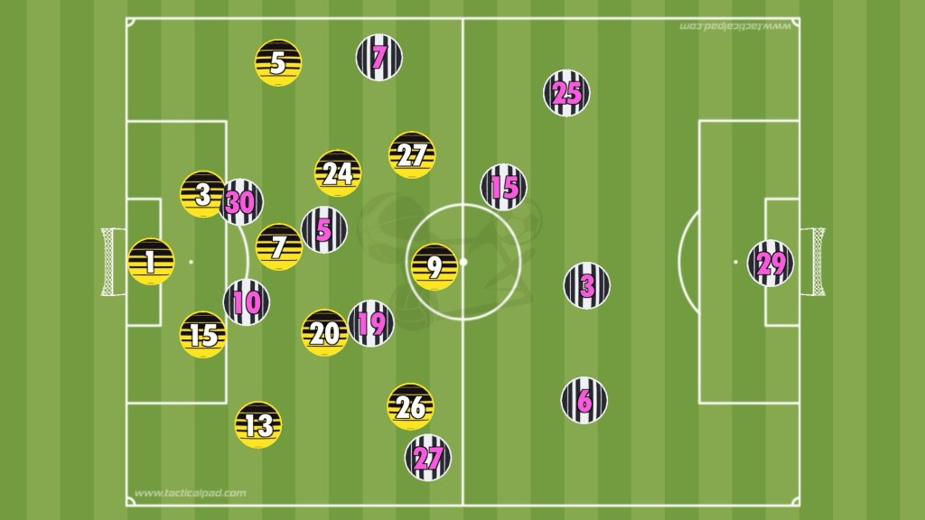 Juventus countered with an aggressive high press. Their centre-forward and left winger pressed side-by-side, forming a two-man first line. Behind them, the two central midfielders pushed high, with the right winger tucked into a right midfield role and the left wing-back stepping up as a left midfielder.