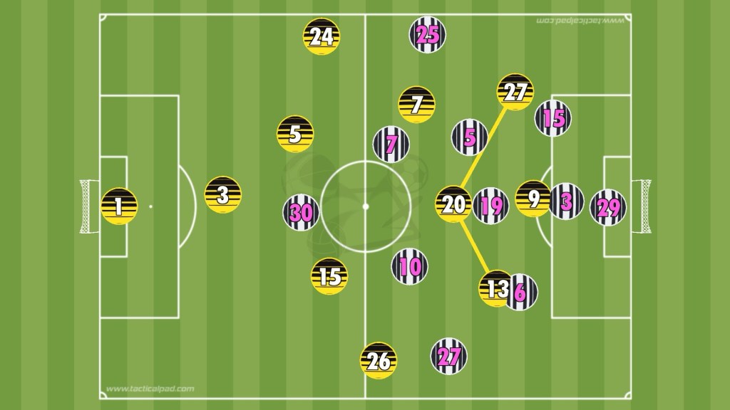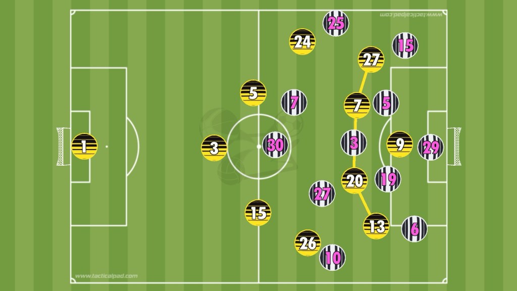 To bypass Juventus’ press, Dortmund adapted. They positioned their right centre-back and sweeper as a traditional centre-back pairing, with the left centre-back operating as a left-back. The right central midfielder moved wide to cover as a right-back, while the left central midfielder dropped into a defensive midfield role.