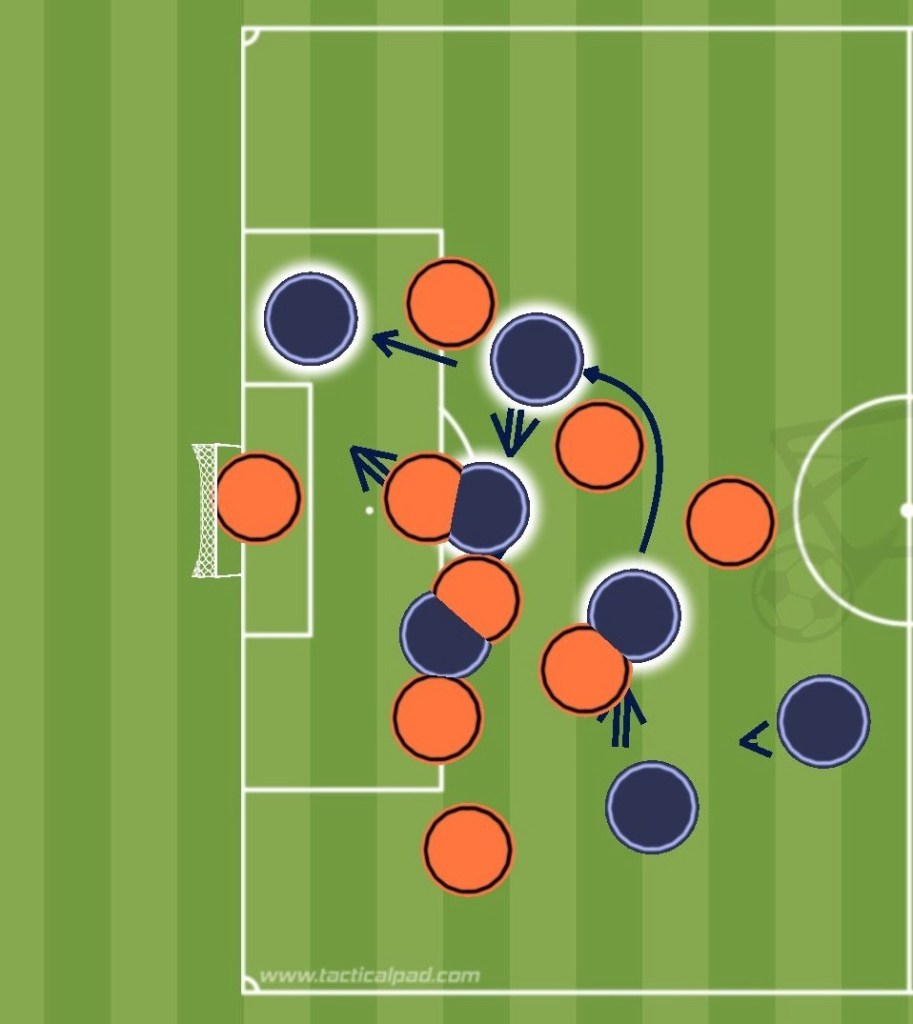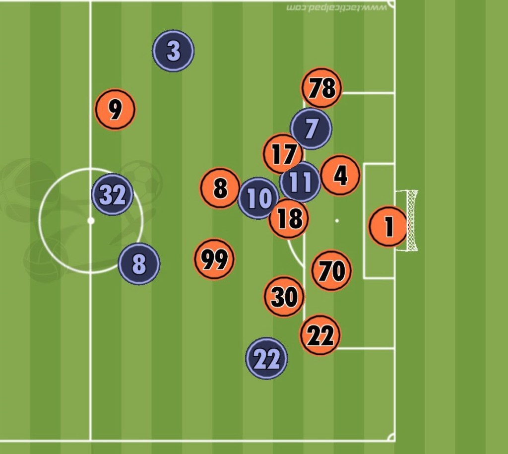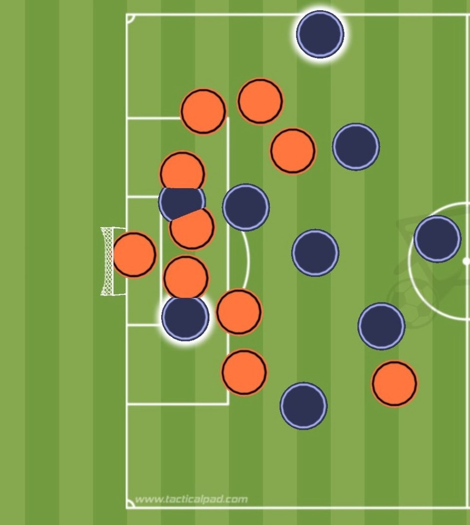 Atromitos’ defensive block was compact and unconventional. Their attacking midfielder dropped into a right-back role, forming a narrow back line alongside the two centre-backs and left-back. Just ahead, a second line added another layer of protection: the right central midfielder sat centrally, while the left central midfielder played wider than usual. The original right-back moved into midfield to mirror this position, while both wide midfielders tucked inside to clog central spaces. The result was a heavily congested middle third that stifled Lazio’s build-up.