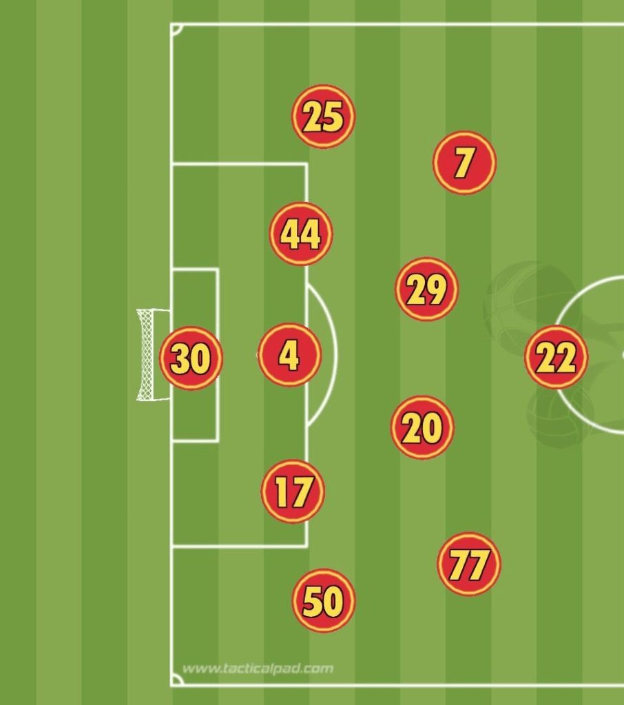 Modrić and Fofana played as advanced central midfielders, drifting wide, while the right wing-back operated almost as a wide midfielder and the left winger stretched the play on the opposite side.