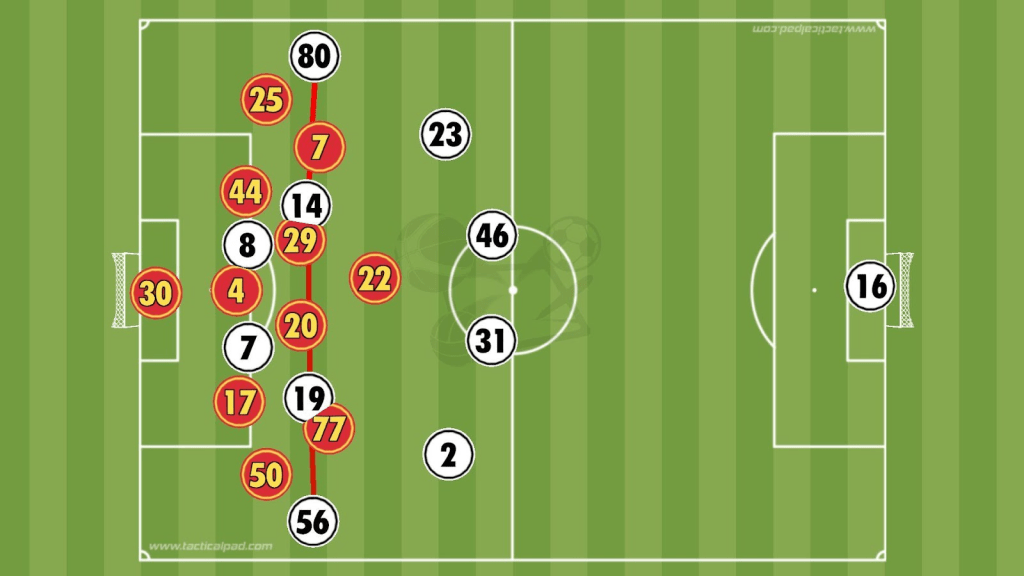 In midfield, the two central midfielders slid across to the right, with the defensive midfielder joining them, while the left winger dropped into midfield. This left only the centre-forward up front. Lecce’s clear aim was to close spaces and neutralise Milan’s attacking threats.