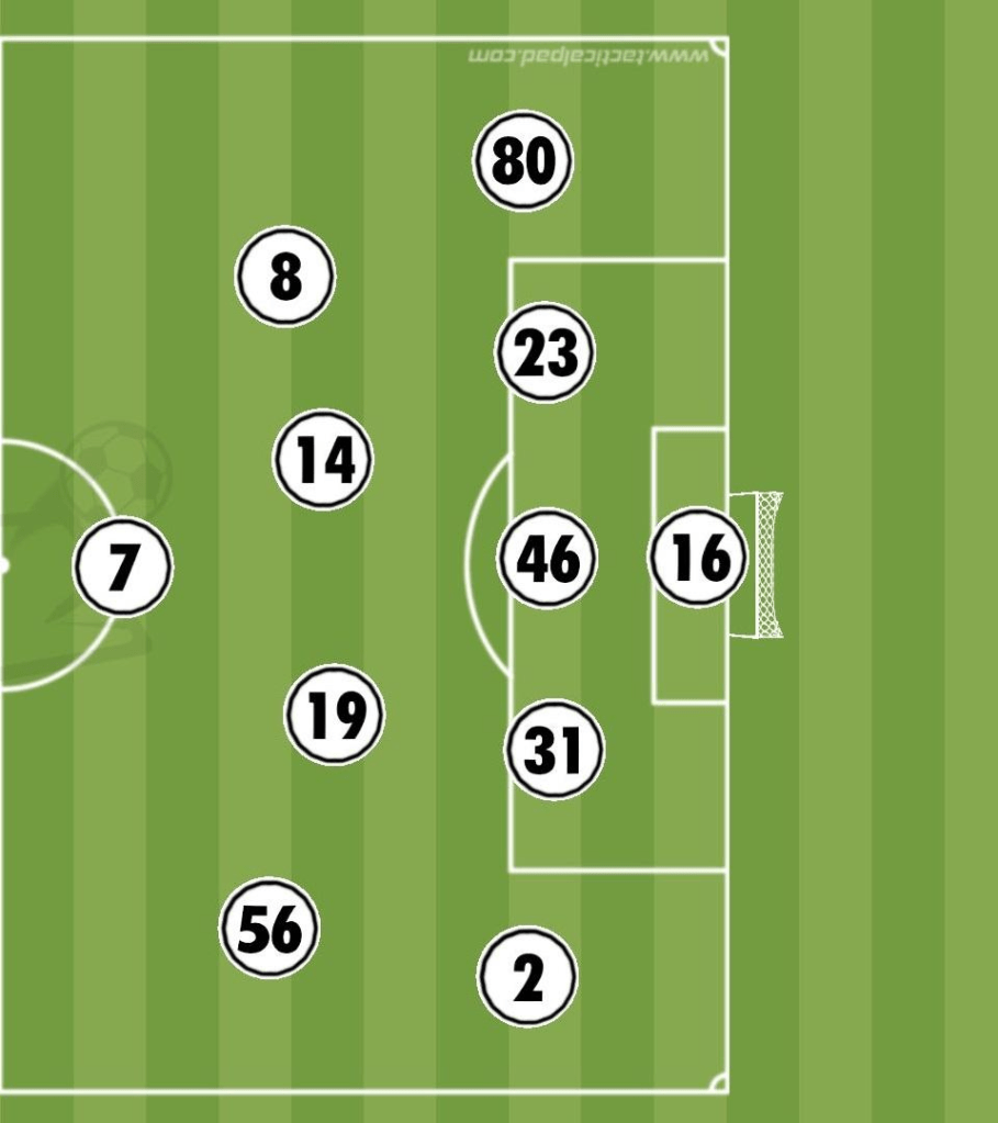Deeper, a back four provided cover, with Tomori shifting out to right-back and Estupiñán filling in at left-back.
