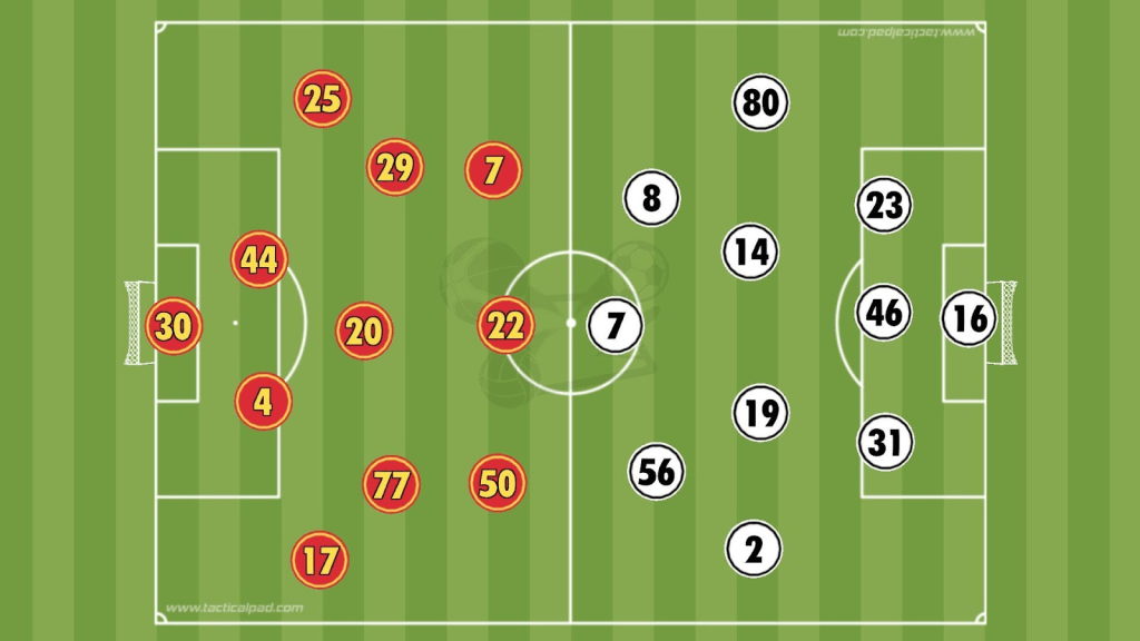 Milan responded by converting Loftus-Cheek from a right winger into a second striker alongside Giménez. Behind them, four players pushed high, looking to pin Lecce deep and dominate the final third.