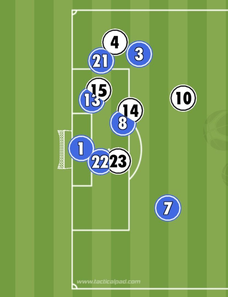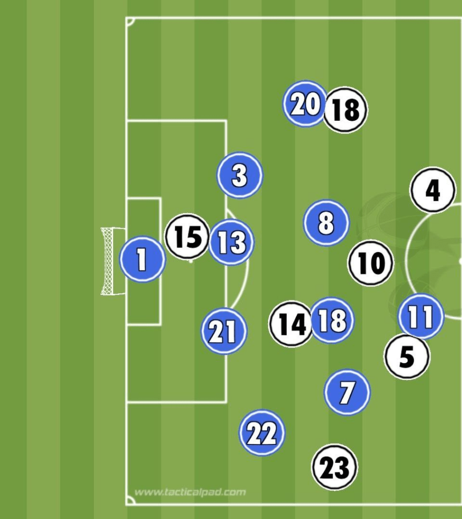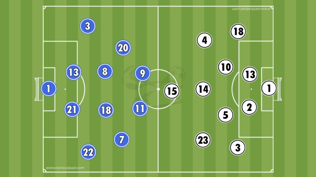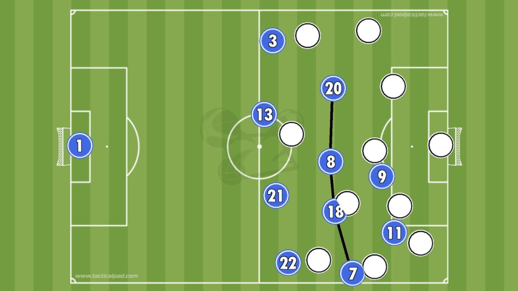 On the other hand, Estonia tried to counter-attack but rarely had success. When they managed to break forward, Italy quickly reorganised to defend. The lack of support runners from Estonia also made it difficult to trouble Italy’s defence. Once again, Italy shifted numbers towards the side where the ball was, suffocating space.