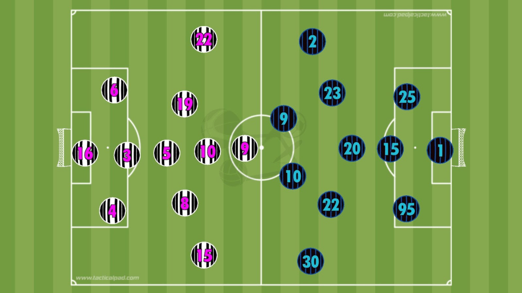 Just behind them, another four-man line provided pressing support and circulation. Thuram shifted from central midfield back into a left wing-back role, while Bremer and Lloyd Kelly acted almost as high centre-backs, with Gatti holding wider on the right.