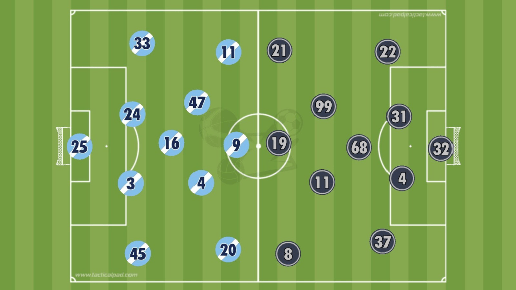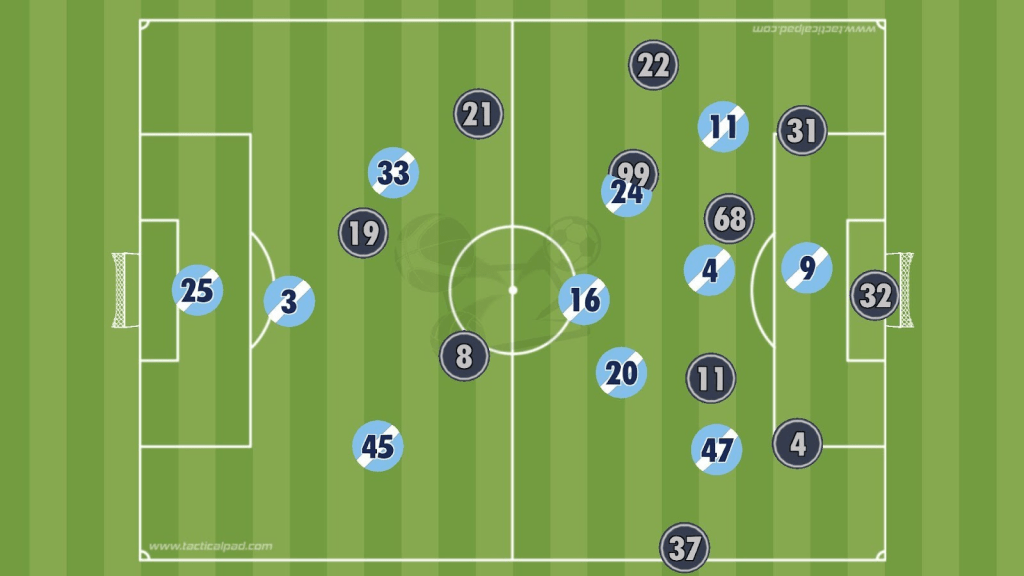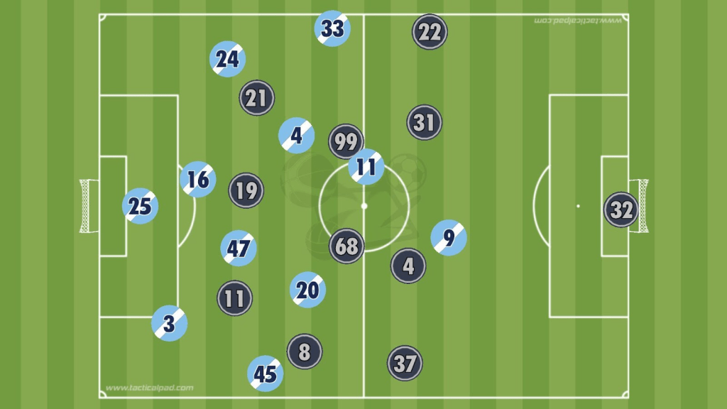 City positioned Rúben Dias wide, Rodri as a central pivot, Gvardiol opened wide as a third defender and full-back, and Khusanov and O’Reilly as wing-backs.