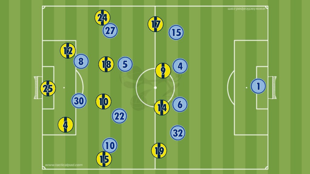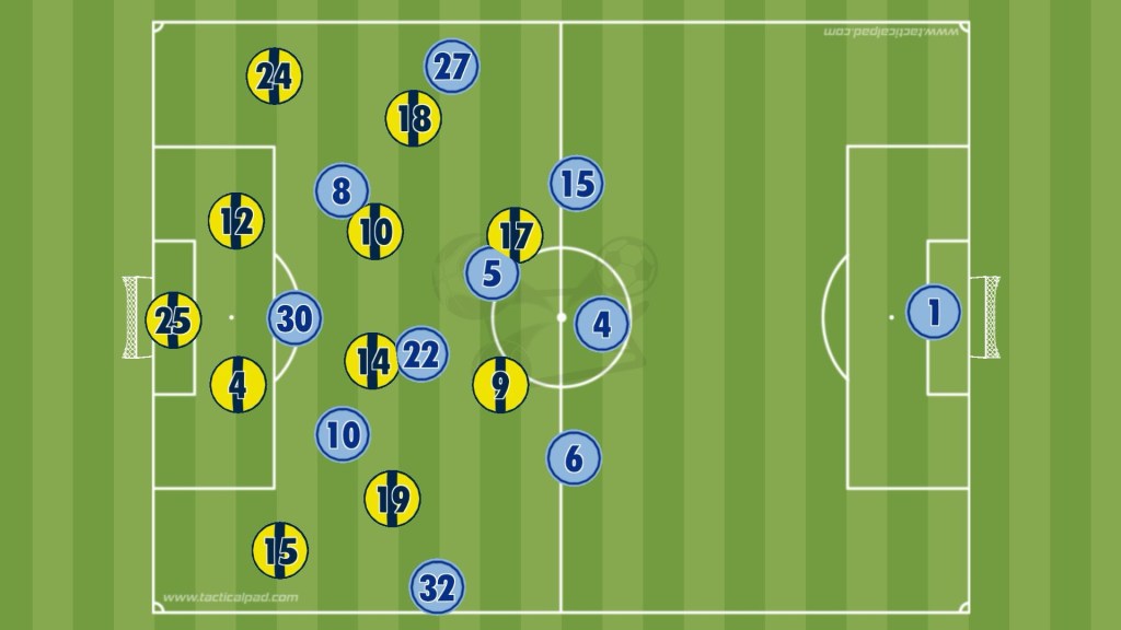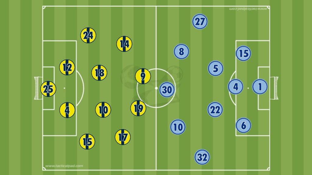 Villarreal’s attacking structure rotated constantly. Georges Mikautadze switched flanks between central forward and left-sided roles, often supported by Tajon Buchanan and Nicolas Pépé as second attackers. Dani Parejo and Pape Gueye alternated central roles, with Álex Baena and Santi Comesaña providing width. Villarreal held a very high line, with the defence stationed on halfway and full-backs positioned narrow.