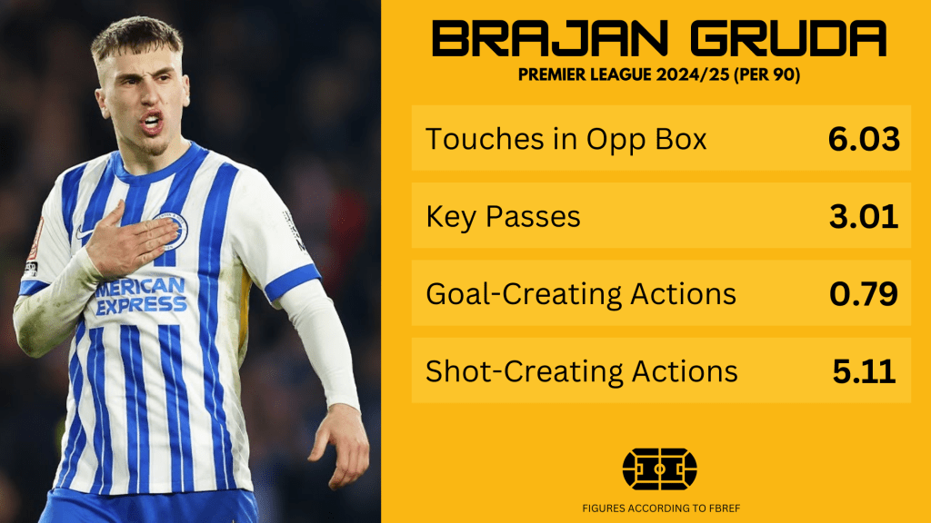 He also ranked in the top 7% for shot-creating actions per 90 with 5.11 and the top 2% for key passes per 90 with 3.01, more than Pascal Gross managed in his final season at Brighton.
