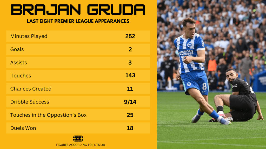 It’s not just his goal involvements though, Gruda’s overall play going forwards has come on massively, and he’s now a real threat in Brighton’s front line.