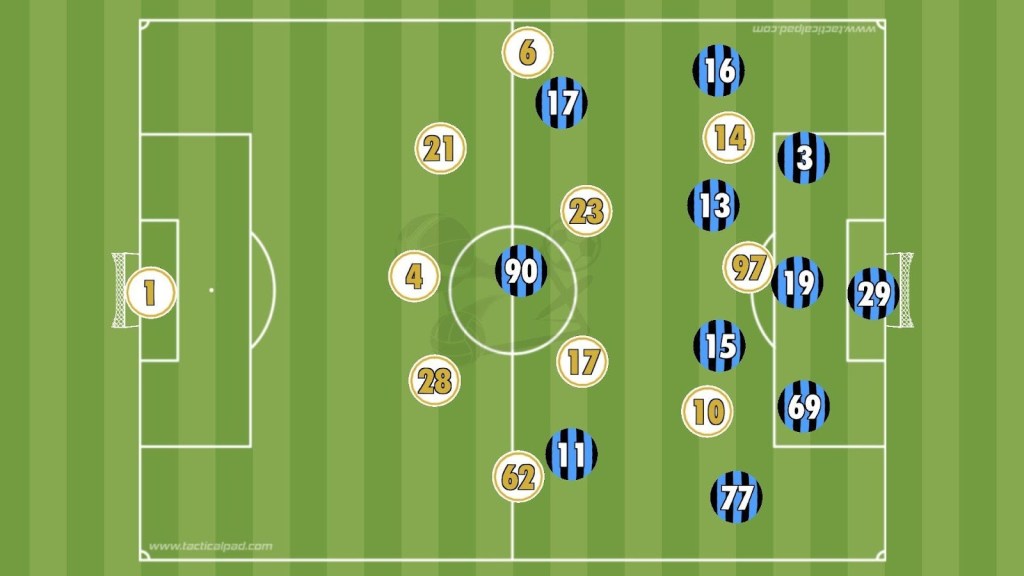 In Atalanta’s second structure, the three centre-backs remained compact inside the penalty area, with Zappacosta and Bellanova acting as traditional full-backs.