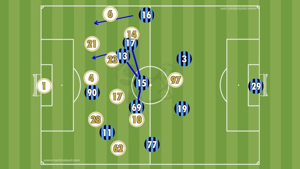 When pressing, Atalanta created a front five, with the centre-forward leading the line and two second-attackers pressing the flanks. Behind them, both central midfielders stepped up to form a second wave of pressure, compressing space in the middle third. The wing-backs stayed narrow while the outer centre-backs supported from just behind.