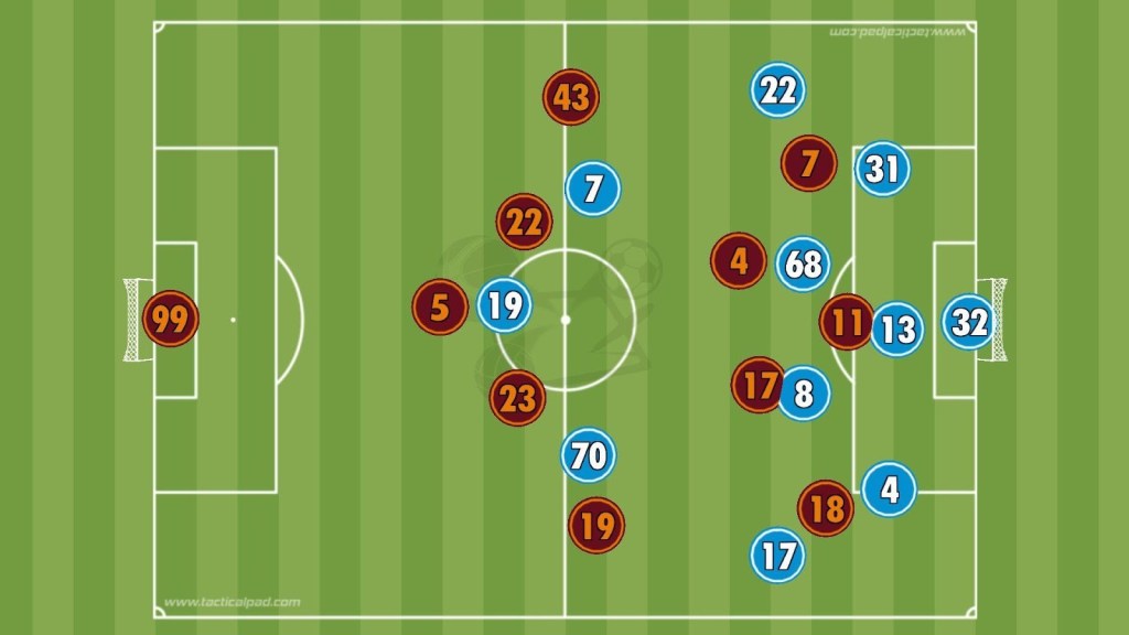 The second strikers positioned themselves close to the centre, with Ferguson the most advanced. This also allowed Roma to attack using long balls and pace on the flanks.