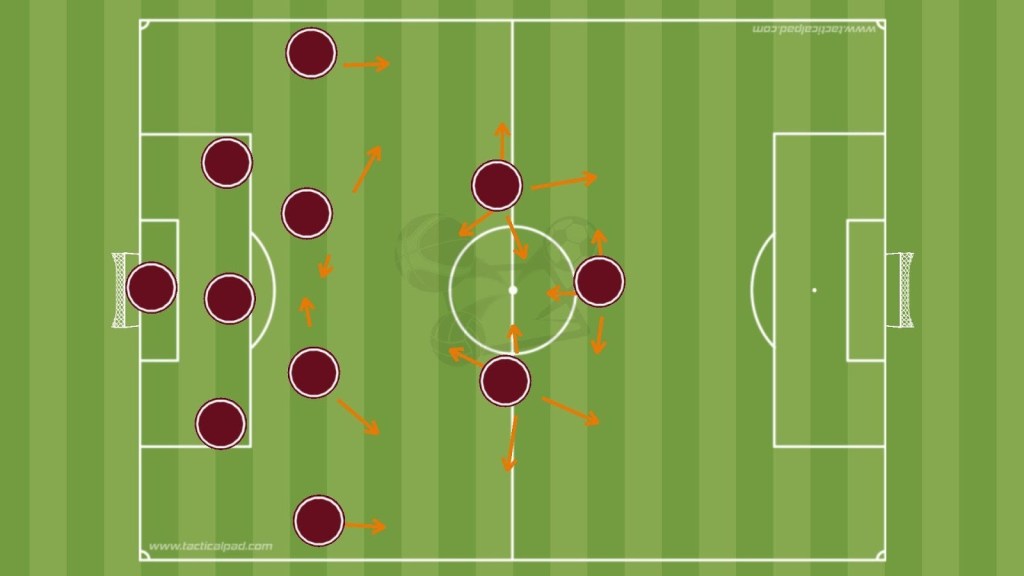 With higher possession, Roma crowd attackers near the opposition box while the defensive line sits on the halfway line, supporting play and guarding against counters. The centre-forward positions between opposition centre-backs, while both second strikers drift wide to exploit chipped passes or crosses. They also drop towards the flanks to combine with the wing-backs.