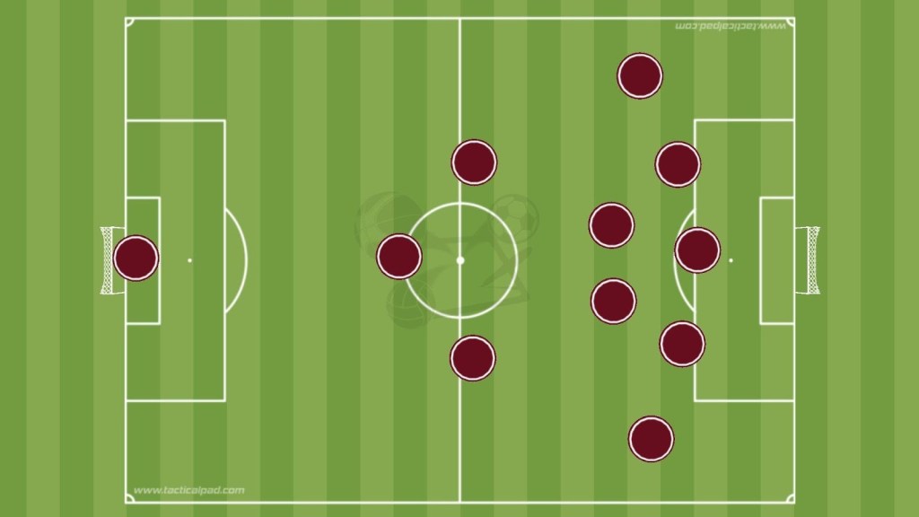 Meanwhile, the two second strikers and the centre-forward remain near the halfway line to contest long balls. The centre-forward stays central but constantly moves to receive and hold the ball, using chest or headers to retain possession and allow the attack to advance.
