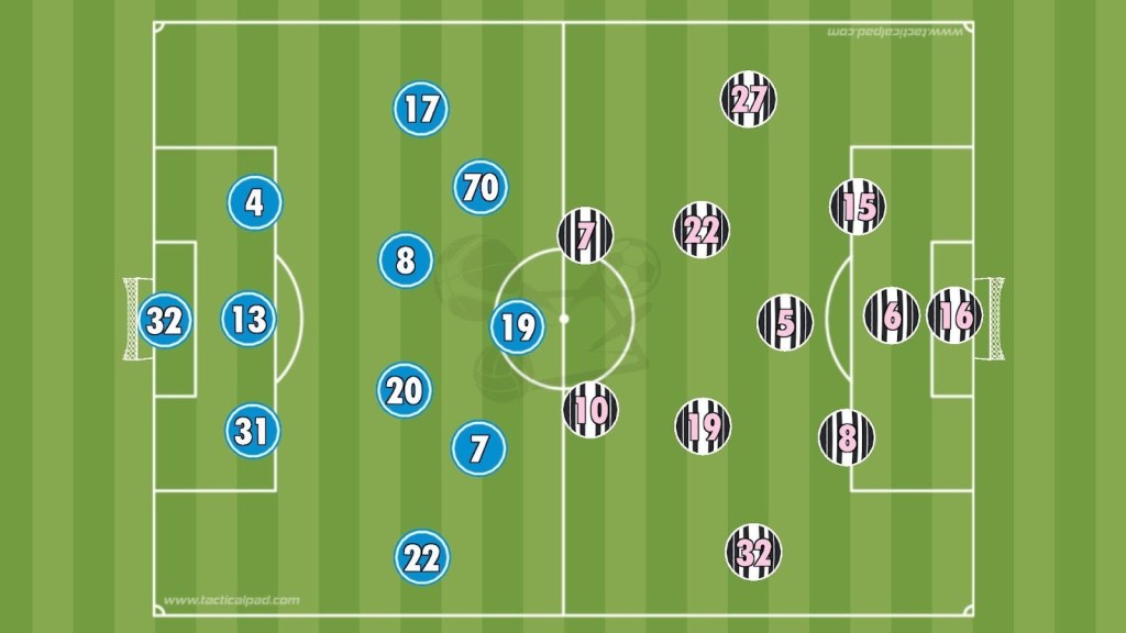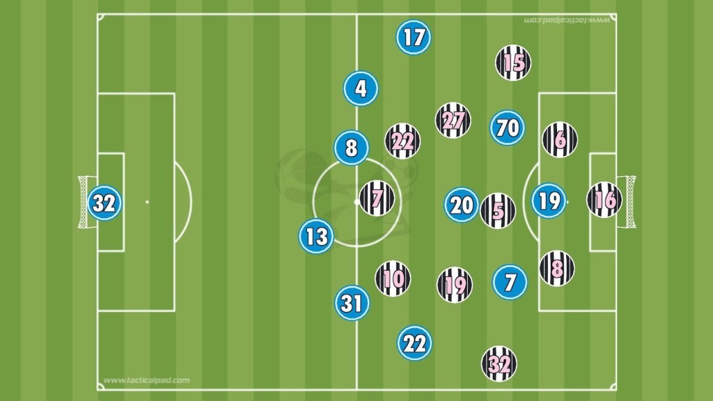 On the rare occasions Juventus attacked, McKennie moved close to the attacking pair, almost acting as a false nine, pushing forward when necessary. Cambiasso and Juan Cabal worked wider, with a defensive line of five behind them. Locatelli dropped deep to improve central distribution, and Thuram played higher up as a centre-back on the ball, helping creativity from deep areas. Koopmeiners and Kalulu stayed wide like wing-backs, securing the flanks and adding numbers.
