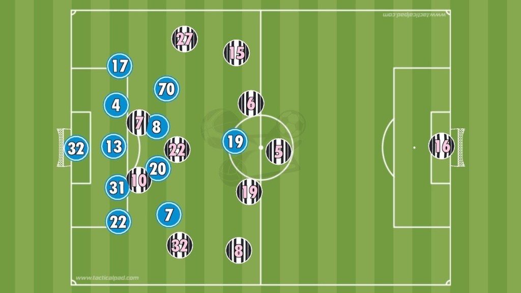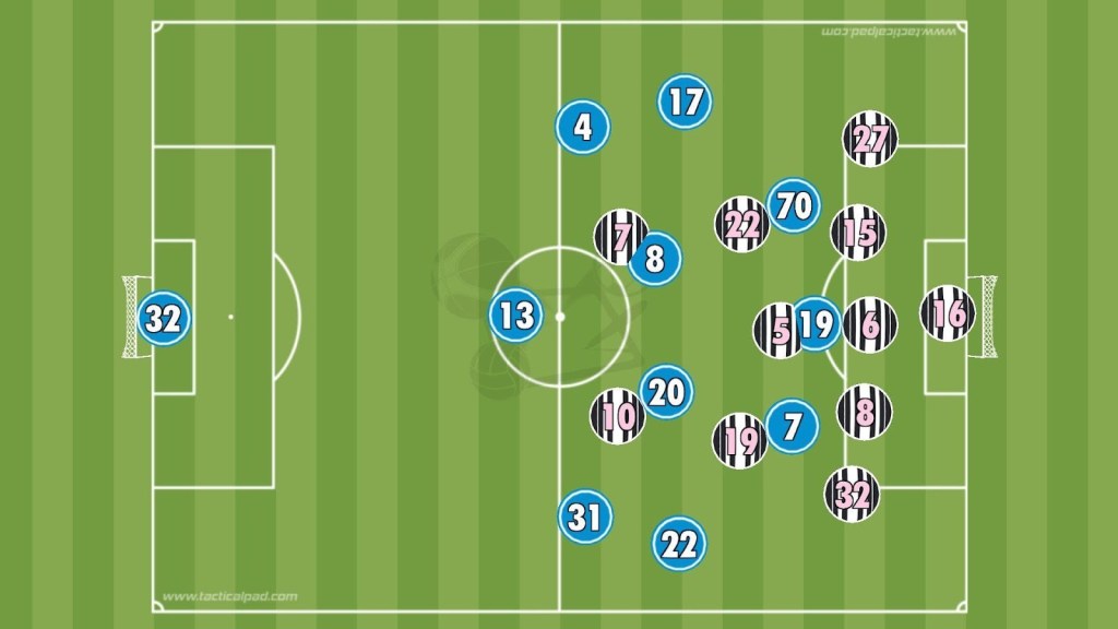 When defending, Juventus narrowed their back line, with the wing-backs dropping deep to act as full-backs, trying to close central gaps. Ahead of them, Locatelli held a position near the box, with Thuram and McKennie acting almost as centre-backs in front. The two attackers formed the first defensive line, starting the press.