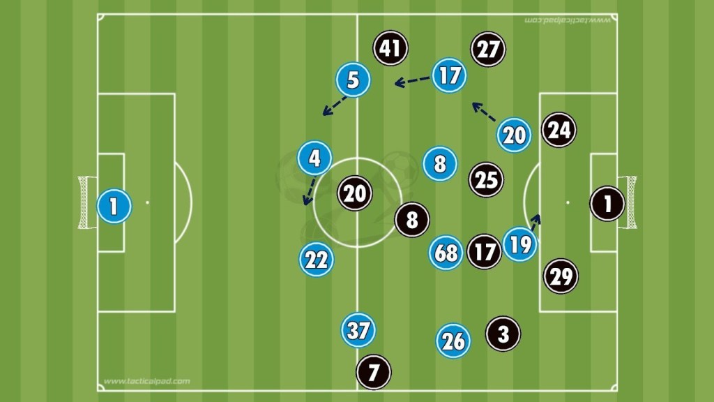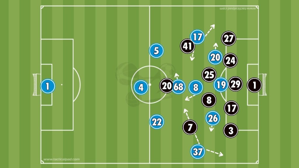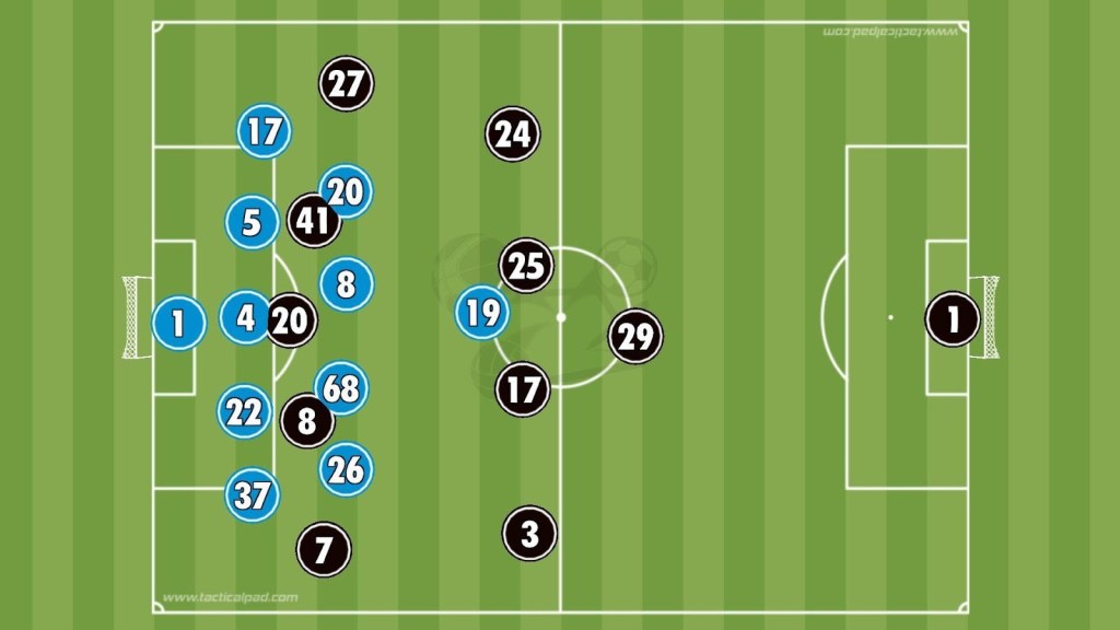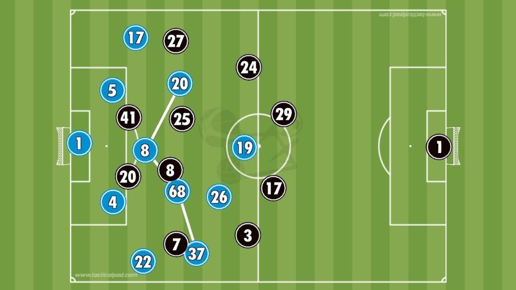 In the 28th minute, Di Lorenzo broke into the area after a misjudgement from James but Sánchez saved with his leg. In the 32nd minute Napoli’s press paid off, with Olivera intercepting and Vergara driving forward before finishing neatly into the corner to equalise.
