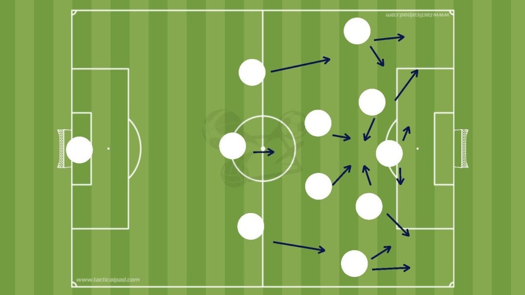 The team often operates in a 3-2-5, with five players occupying the box or its edges, focusing on crosses. At times it resembles a 1-4-5, with wide centre-backs advancing into midfield areas. The primary aim is to move the ball quickly to the wingers or second attackers, either to deliver crosses or to attack central spaces through dribbling.